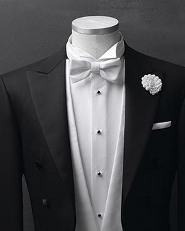 Lorsque l’invitation mentionne „White Tie“, vous êtes sollicités à porter une queue de pie avec les accessoires: pantalon avec deux galons de soie sur les côtés, gilet en piqué blanc avec une ouverture profonde en V, chemise de frac blanche avec goujons, noeud papillon blanc, chaussures noires laquées et peut-être
